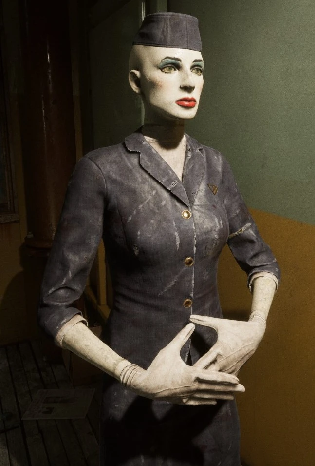Her mannequin avatar portrays her as a formally dressed lady with red lipstick and blue eye shadow. This mannequin always wears a navy blue suit jacket, dress skirt and beret akin to an air hostess. The mannequin also wears a pair of white gloves, high heel shoes, and two Murkoff logo badges pinned to her beret and upper chest.