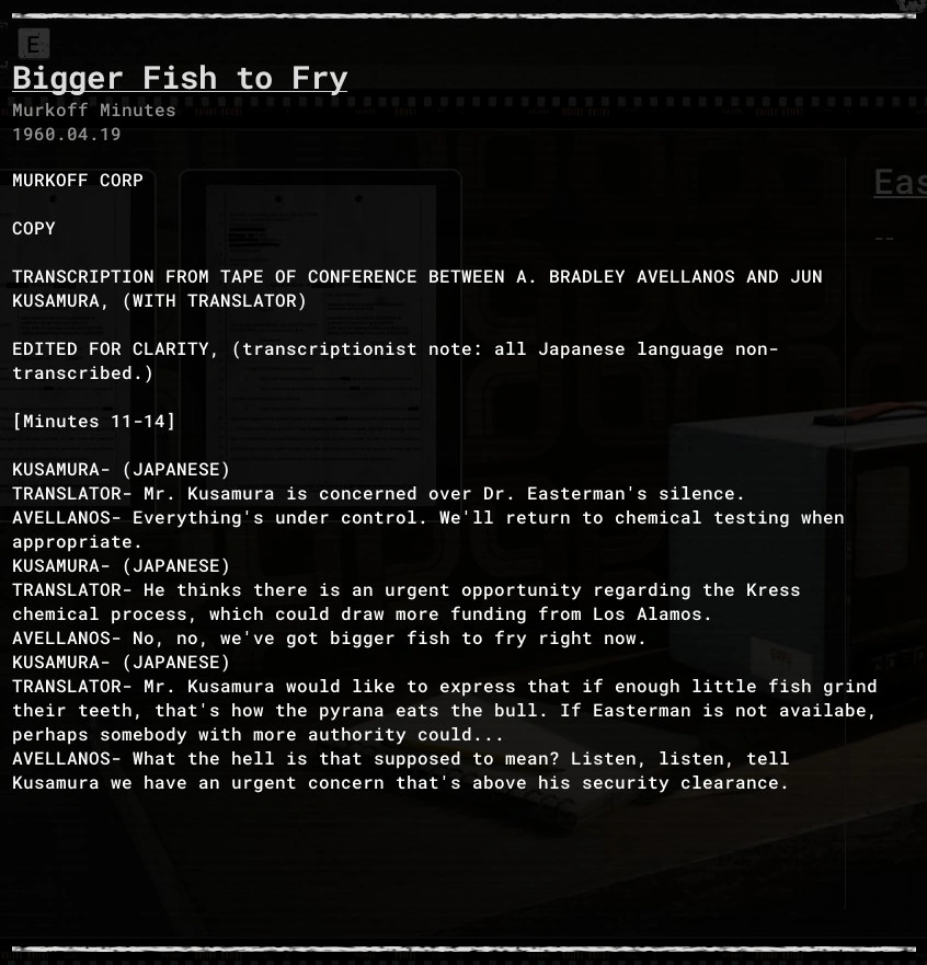 Bigger Fish to Fry is an evidence file in The Outlast Trials.