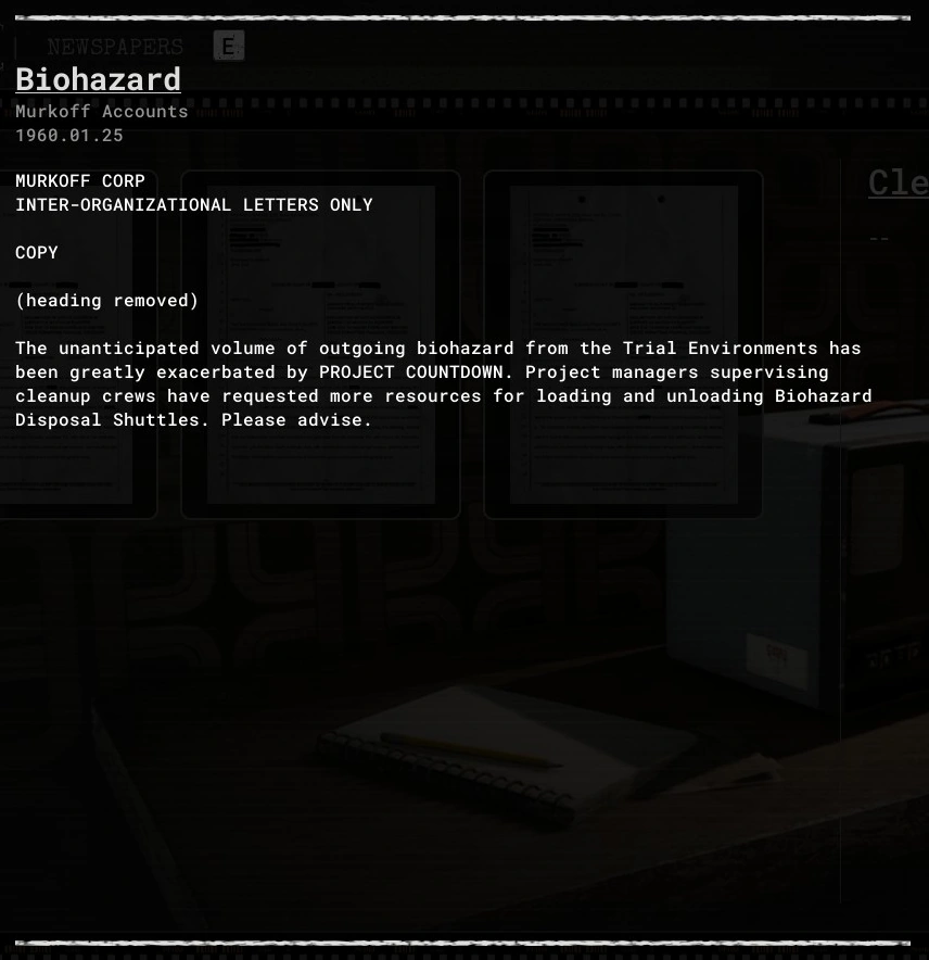 Biohazard is an evidence file in The Outlast Trials.