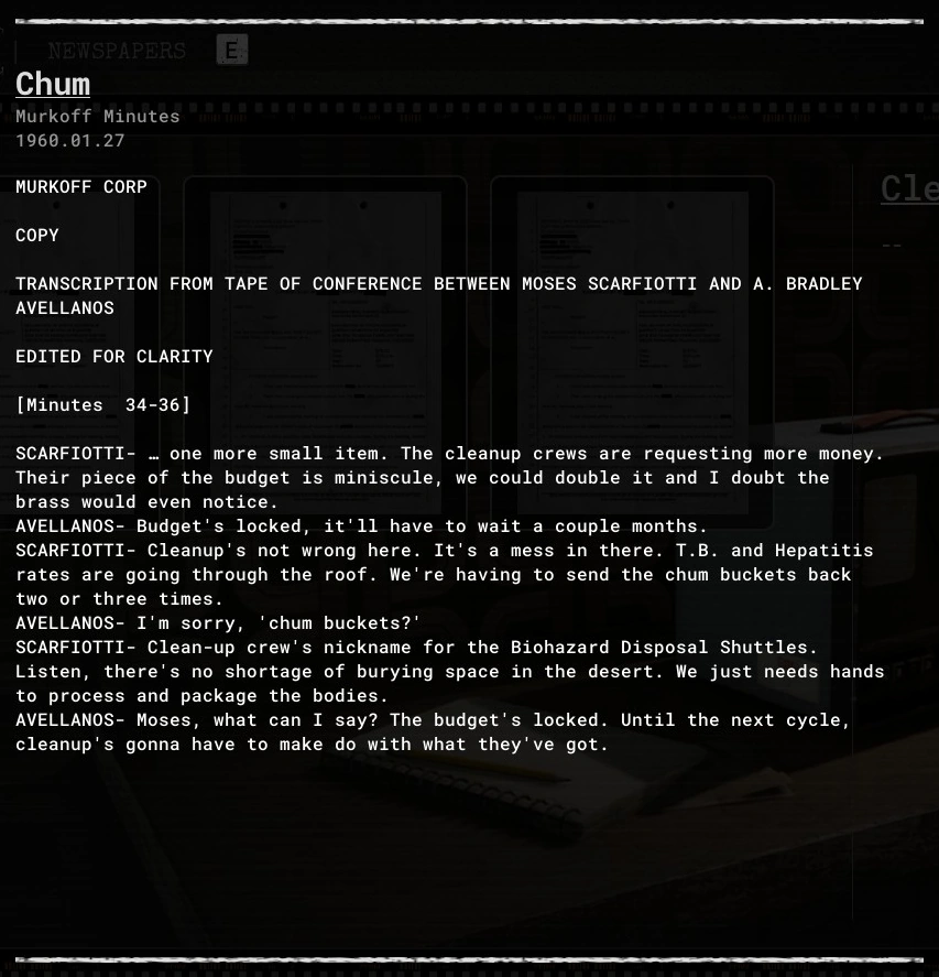 SCARFIOTTI- Clean-up crew's nickname for the Biohazard Disposal Shuttles. Listen, there's no shortage of burying space in the desert. We just needs hands to process and package the bodies.
