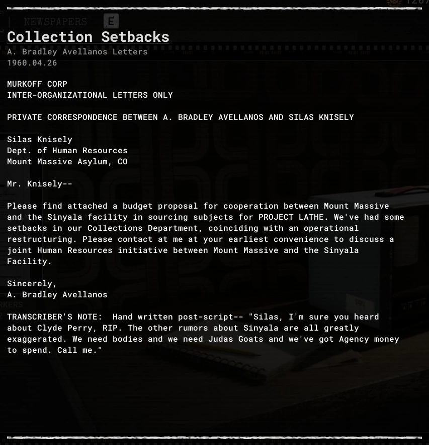 Collection Setbacks is an evidence file in The Outlast Trials.
