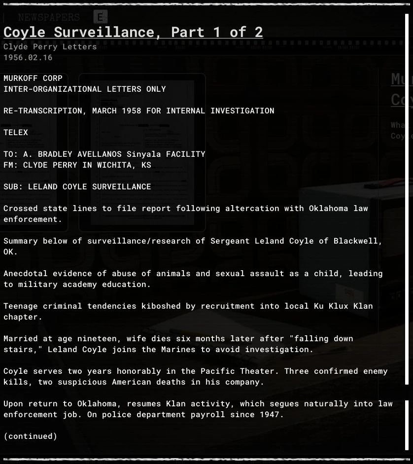 Coyle Surveillance, Part 1 of 2 is an evidence file in The Outlast Trials.
