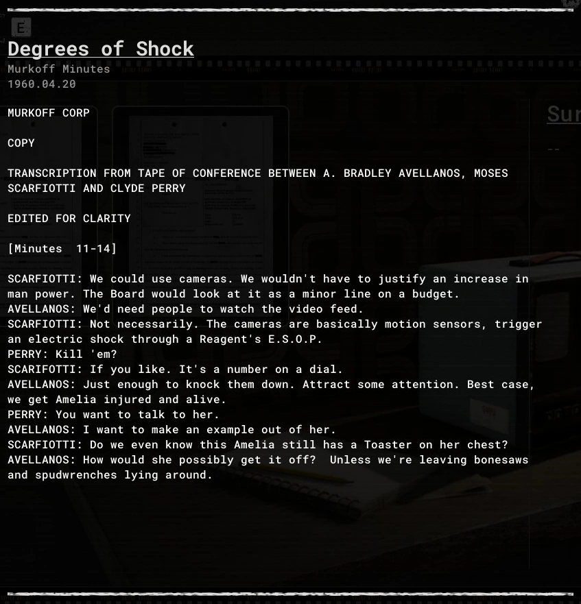 Degrees of Shock is an evidence file in The Outlast Trials.