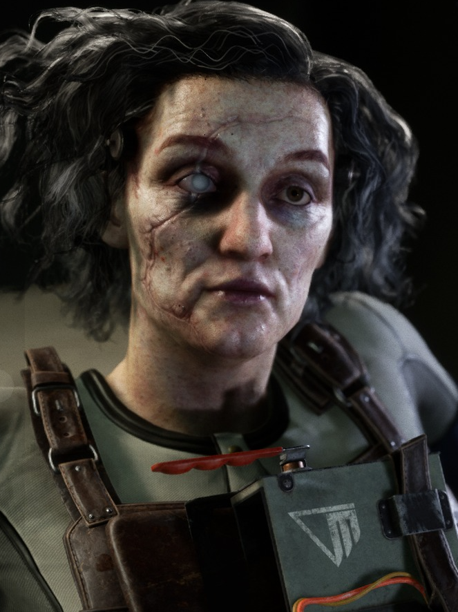 Dorris is a pale-skinned Caucasian woman of average height and build. She has long, unkept black hair, scars across her face and appears to be in her 30s. She has brown eyes, however, one is a bright cyan and most likely blind from an injury she suffered in a trial. She wears a unique skin-tight grey Reagent uniform. She sports a default green ESOP without a rig, and notably also lacks the night vision googles and communication wristlet that all the other Reagents are equipped with.