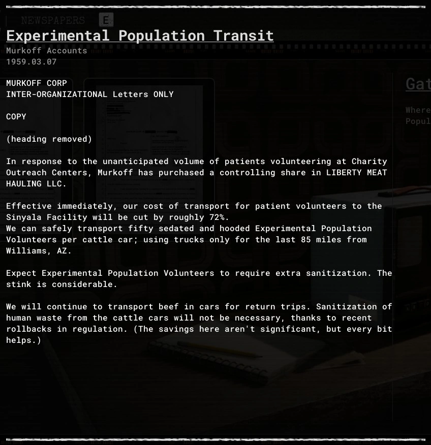 Experimental Population Transit is an evidence file in The Outlast Trials.