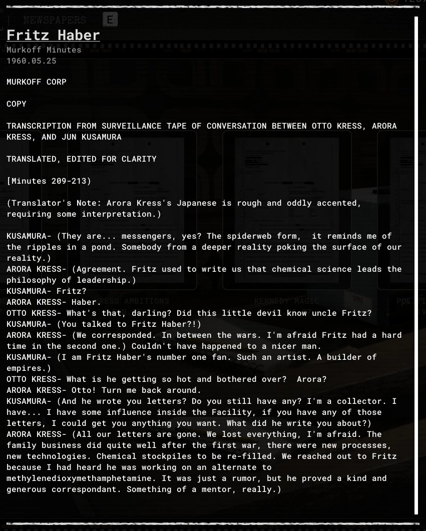 ARORA KRESS- (All our letters are gone. We lost everything, I'm afraid. The family business did quite well after the first war, there were new processes, new technologies. Chemical stockpiles to be re-filled. We reached out to Fritz because I had heard he was working on an alternate to methylenedioxymethamphetamine. It was just a rumor, but he proved a kind and generous correspondant.[sic] Something of a mentor, really.)"