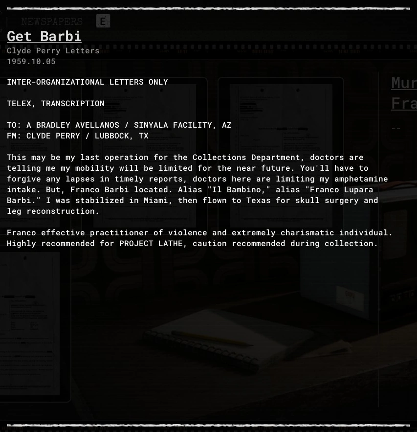This may be my last operation for the Collections Department, doctors are telling me my mobility will be limited for the near future. You'll have to forgive any lapses in timely reports, doctors here are limiting my amphetamine intake. But, Franco Barbi located. Alias "Il Bambino," alias "Franco Lupara Barbi." I was stabilized in Miami, then flown to Texas for skull surgery and leg reconstruction.