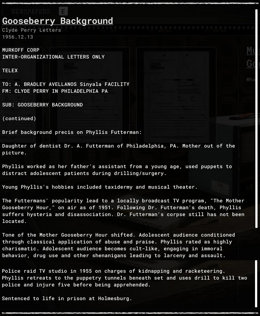 Gooseberry Background is an evidence file in The Outlast Trials.