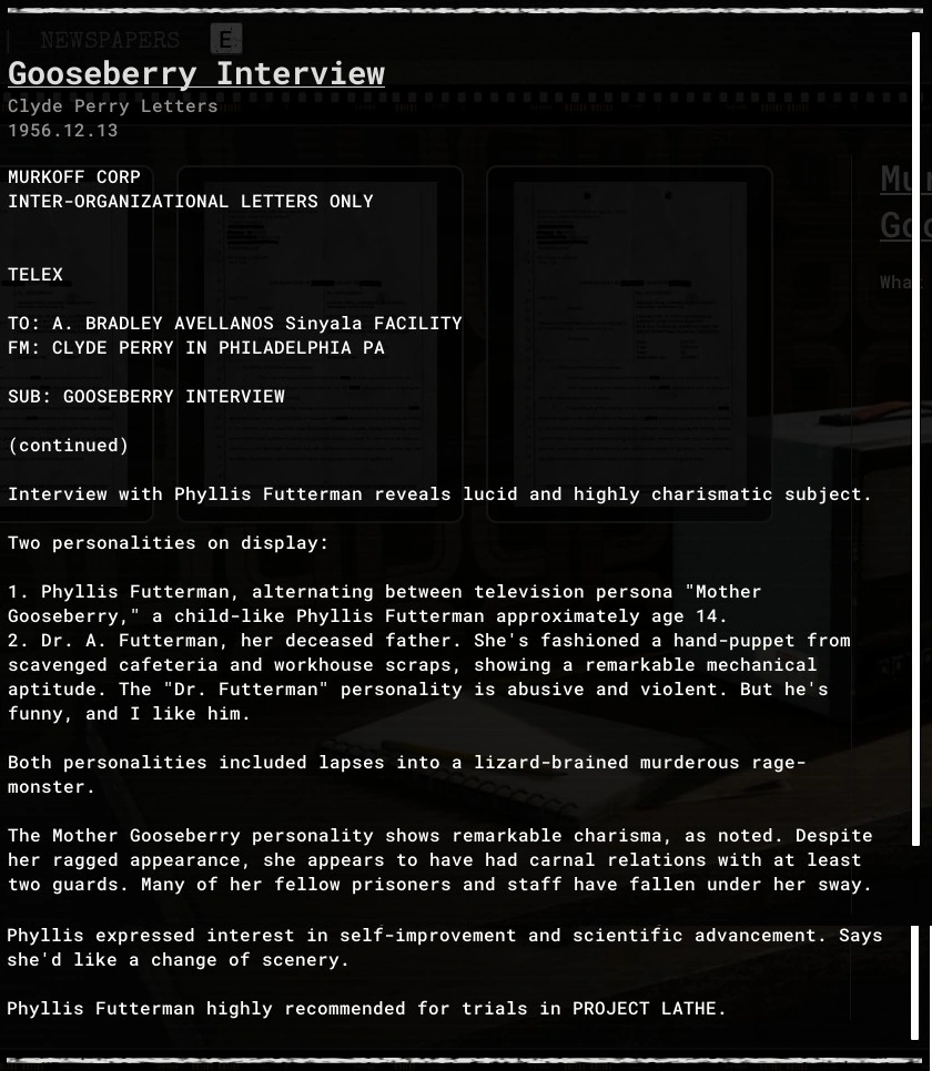 Gooseberry Interview is an evidence file in The Outlast Trials.
