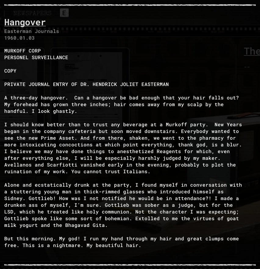 Hangover is an evidence file in The Outlast Trials.