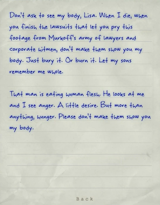 - "Don't ask to see my body, Lisa. When I die, when you finish the lawsuits that let you pry this footage from Murkoff's army of lawyers and corporate hitmen, don't make them show you my body. Just bury it. Or burn it. Let my sons remember me whole.