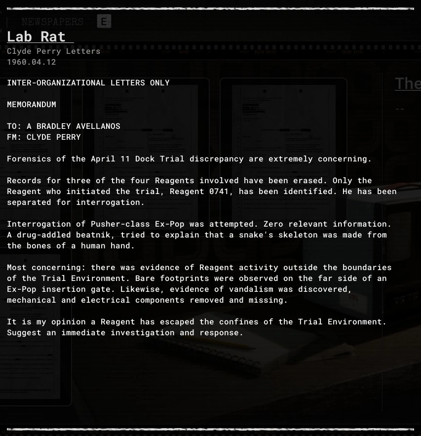 Lab Rat is an evidence file found in The Outlast Trials.