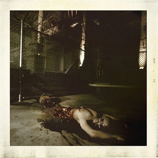 The evidence file presents a photograph of a dead Reagent, split in half and lying outside the boundaries of a barbed wire fence at the Mansion.