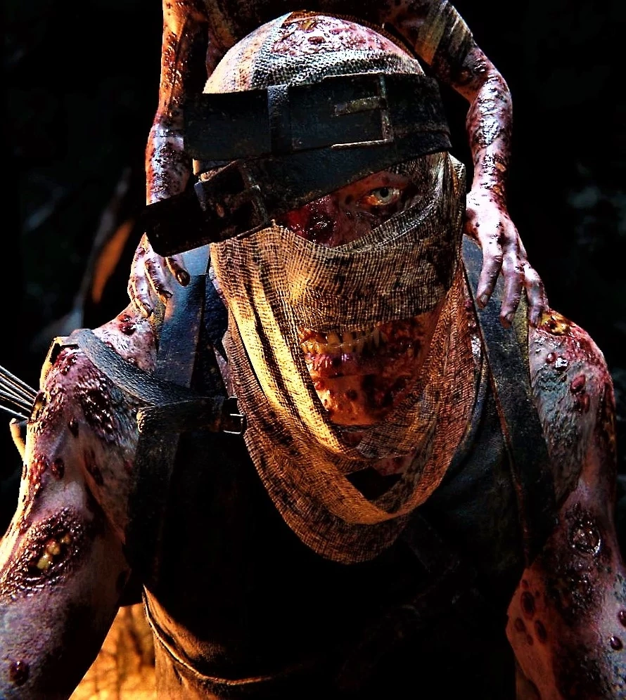 Nick is an inhumanly large, hunched, hulking brute who is covered from head to toe in infected, pus-filled sores. Like many of the Scalled, his sores are likely due to syphilis and other STDs. His entire head is wrapped around in bandages, which obscures most of his facial features except for his left eye and mouth (which appears to be torn at the side). His right eye is mostly covered up, although a small glimpse on its side implies that it has been severely damaged. He wears a torn-up, sleeveless shirt, torn trousers with a belt around his hips, as well as what appears to be a metal leg brace around his left leg and walks barefoot. Nick also has a hook with a T-handle wrapped around his hips with a chain and a large satchel on his back, which contains Laird's arrows conveniently prepared for the latter's use. Nick is most notably equipped with a leather saddle on his back for Laird to ride in, which is strapped around his arms, as well as featuring a belt which straps around Laird to keep him in place, and two more larger belts that connect directly to the saddle itself which strap around Nick's forehead.