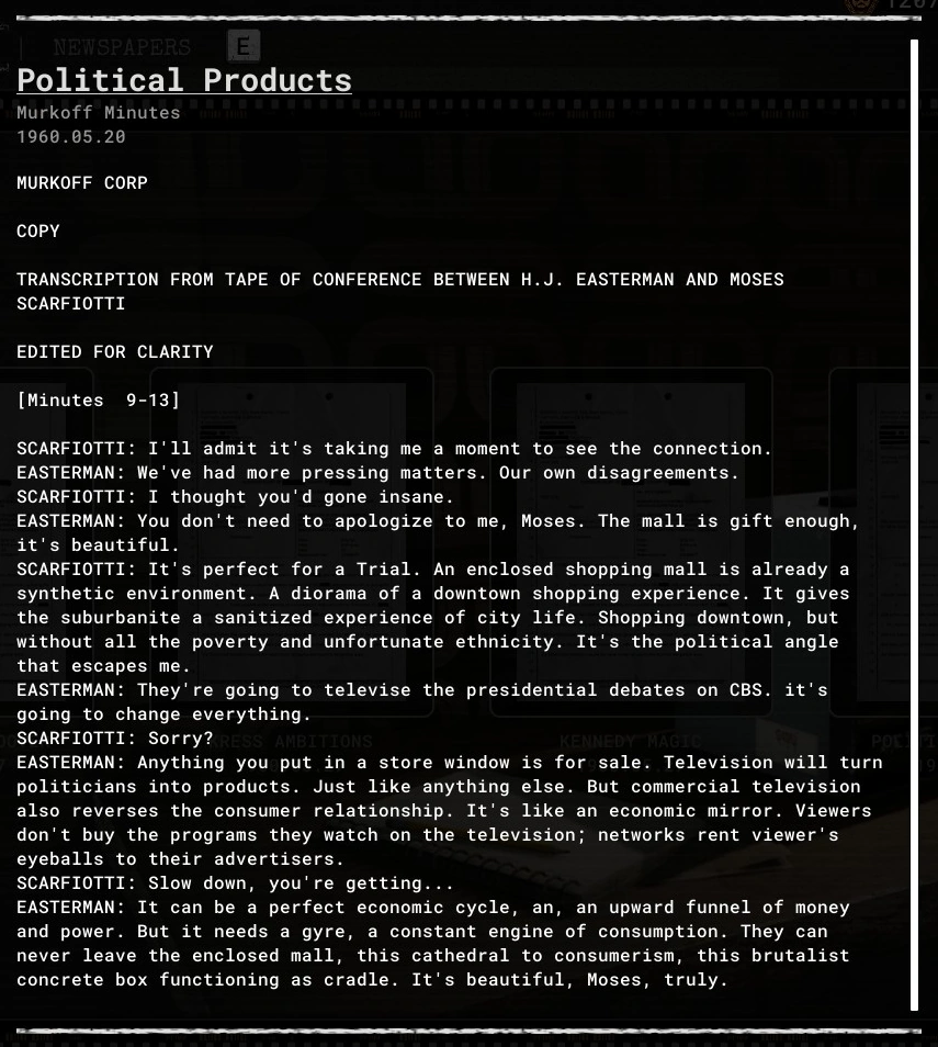 Political Products is an evidence file in The Outlast Trials.