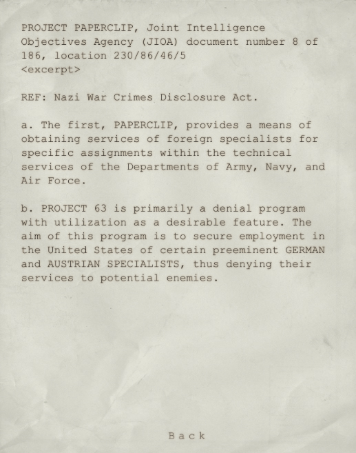 a. The First, PAPERCLIP, provides a means of obtaining services of foreign specialists for specific assignments within the technical services of the Departments of Army, Navy, and Air Force.