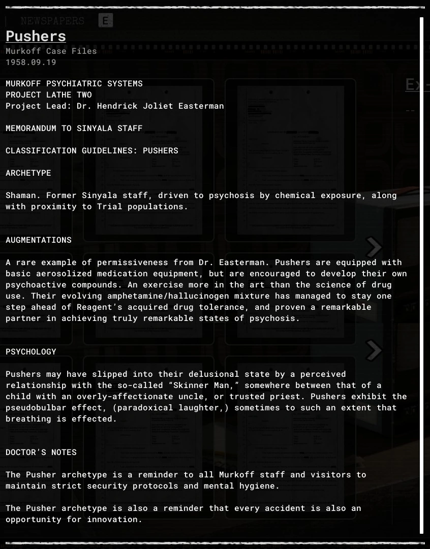 Pushers is an evidence file in The Outlast Trials.