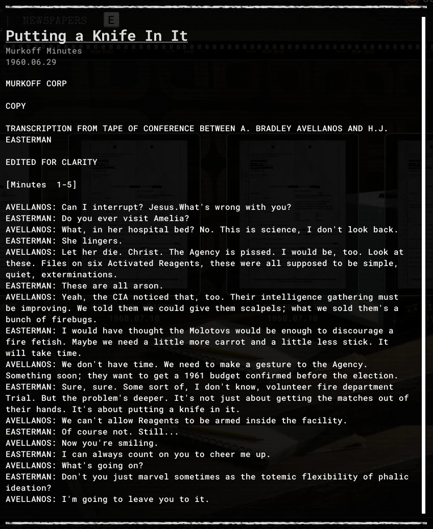 AVELLANOS: Let her die. Christ. The Agency is pissed. I would be, too. Look at these files. Files on six activated Reagents, these were all supposed to be simple, quiet, exterminations.