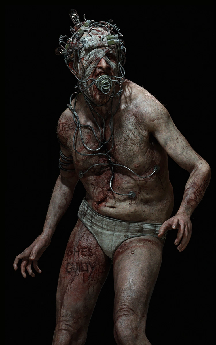 Their bandages on the face are bloody, and their bodies are is seemingly unwashed. The skin of the Scapegoats has been mutilated, with words carved into their deltoid, underarm, and thigh. It is likely that these carvings are courtesy of Leland Coyle, who is known to engage in such activity, carving into the body of The Snitch as well. The most prominent carving located on their thigh reads "She's guilty", in reference to the Avellanos mannequin whose innocence the Reagents are there to defend in hunting down the Scapegoats.