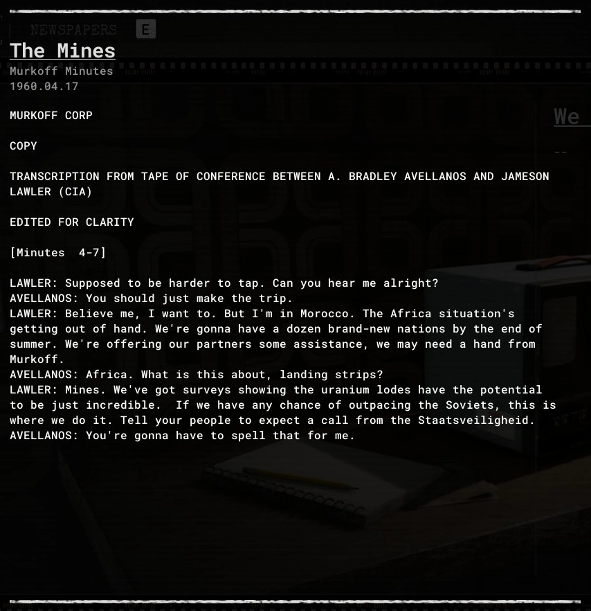 LAWLER: Mines. We've got surveys showing the uranium lodes have the potential to be just incredible. If we have any chance of outpacing the Soviets, this is where we do it. Tell your people to expect a call from the Staatsveiligheid.
