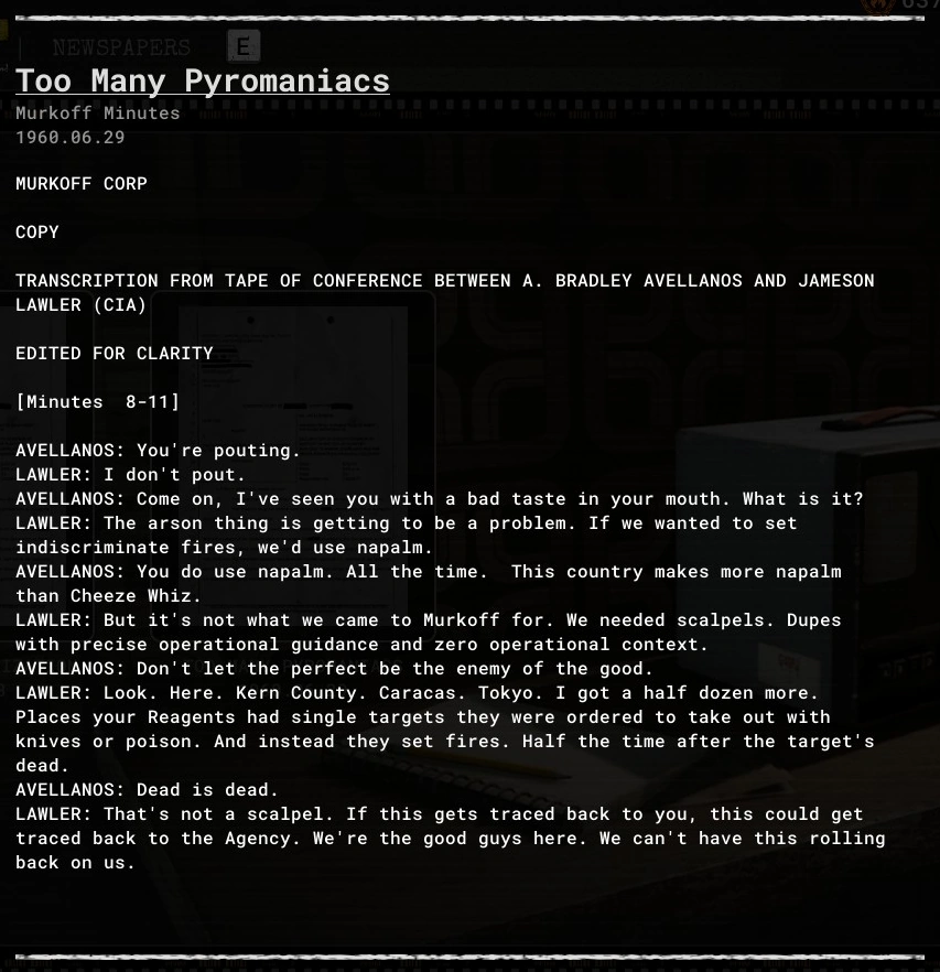 LAWLER: But it's not what we came to Murkoff for. We needed scalpels. Dupes with precise operational guidance and zero operational context.