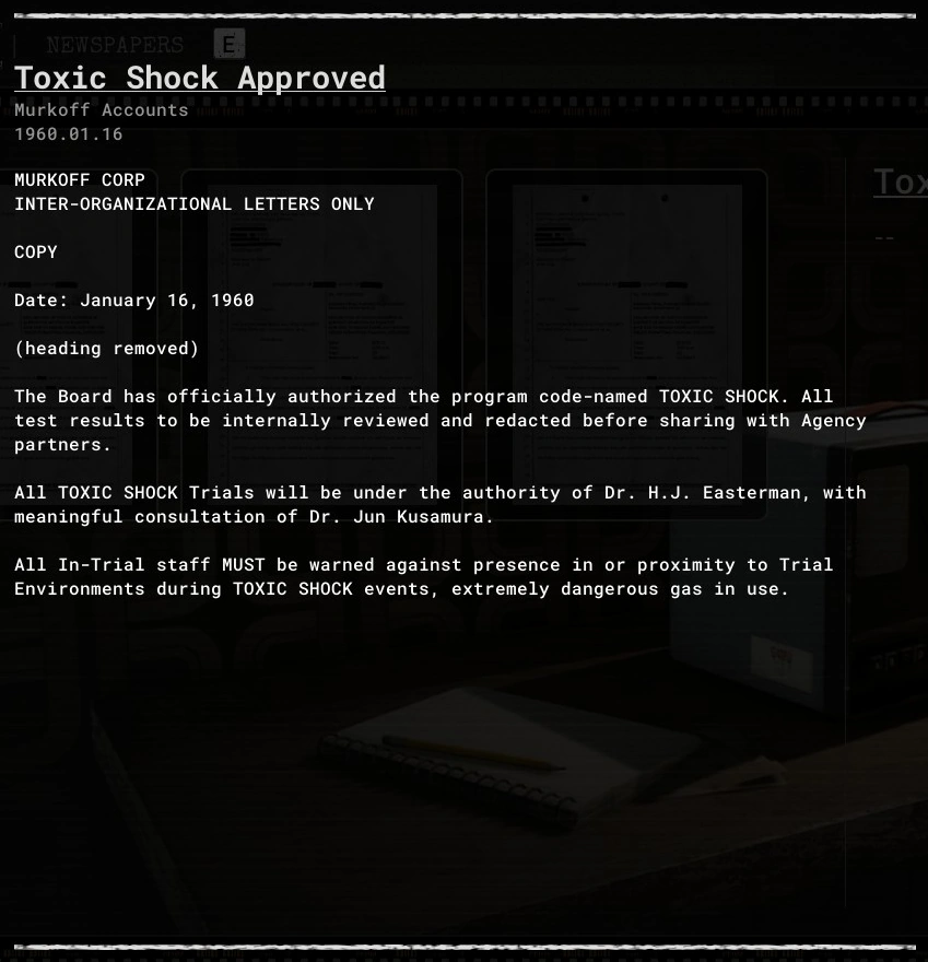 Toxic Shock Approved is an evidence file in The Outlast Trials.