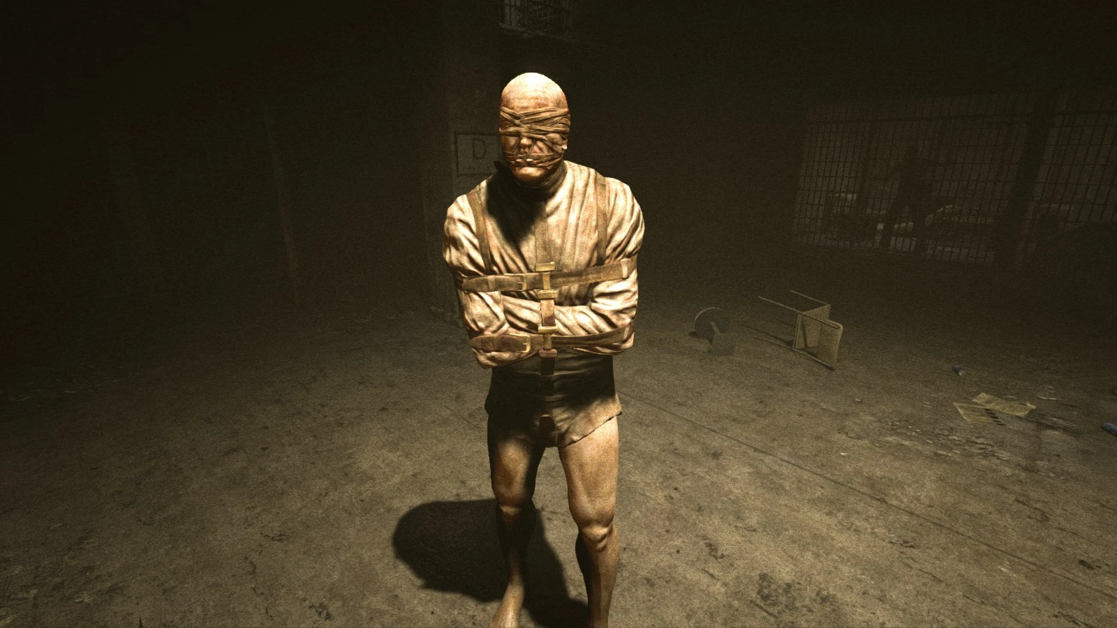 The blindfolded Variant is a non-hostile Variant that is first encountered in the Prison Block. He is blindfolded and gagged by bandages and bound in a straitjacket, rendering him incapable of physical assault, and will simply follow Miles as he wanders around a cell block. He will often comment on how Miles looks 'silky' and complains about an itch, among other disjointed phrases.