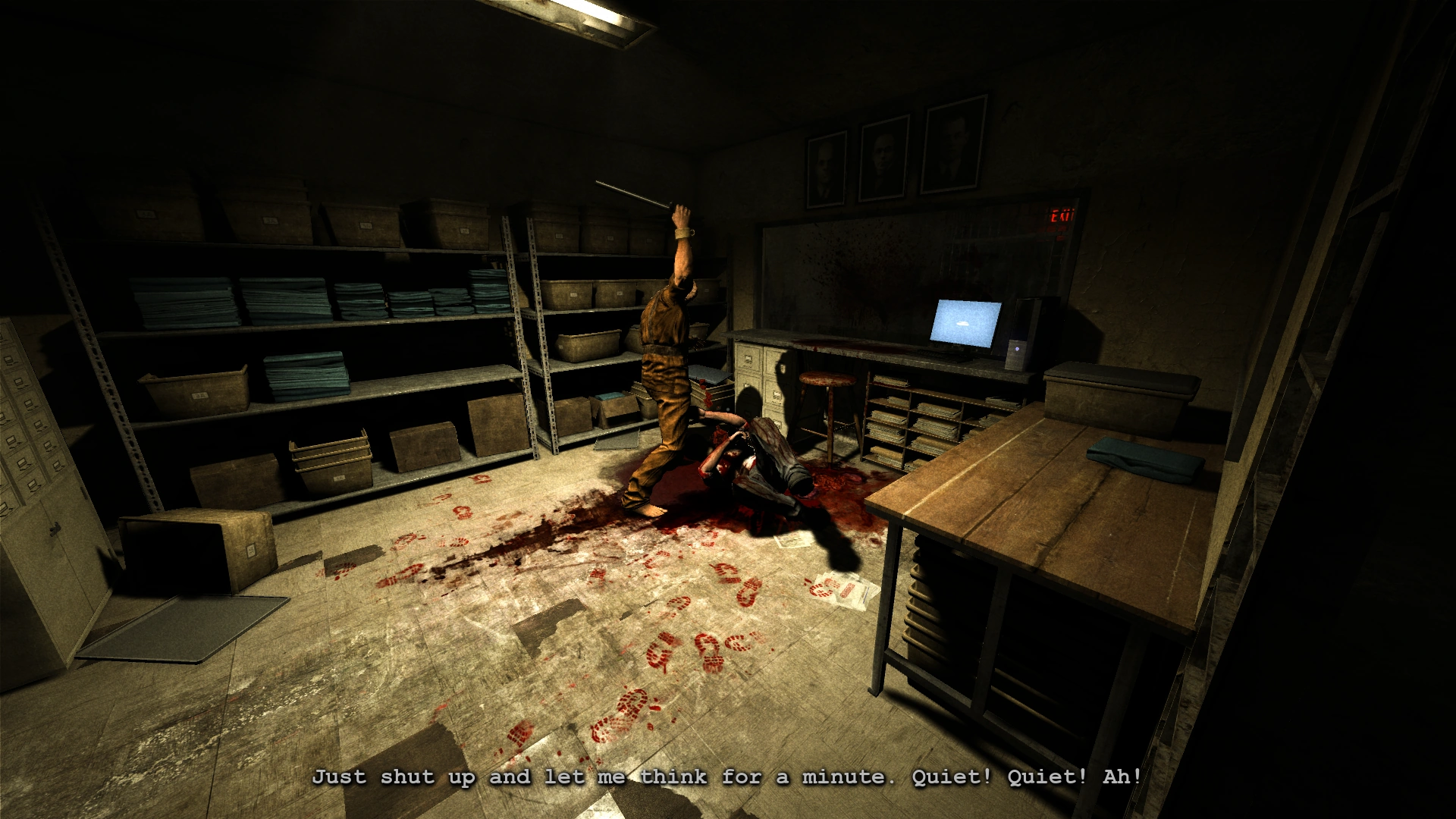 While traversing Male Ward's infirmary, Miles drops from an air duct into a closed off room and encounters a tortured security guard tied to a chair who wails hysterically upon seeing him, which alerts three other nearby Variants. After a lengthy chase, Miles is cornered into a storage room, but manages to escape his pursuers via a dumbwaiter sent to him by Richard Trager, who ends up luring him into a trap.