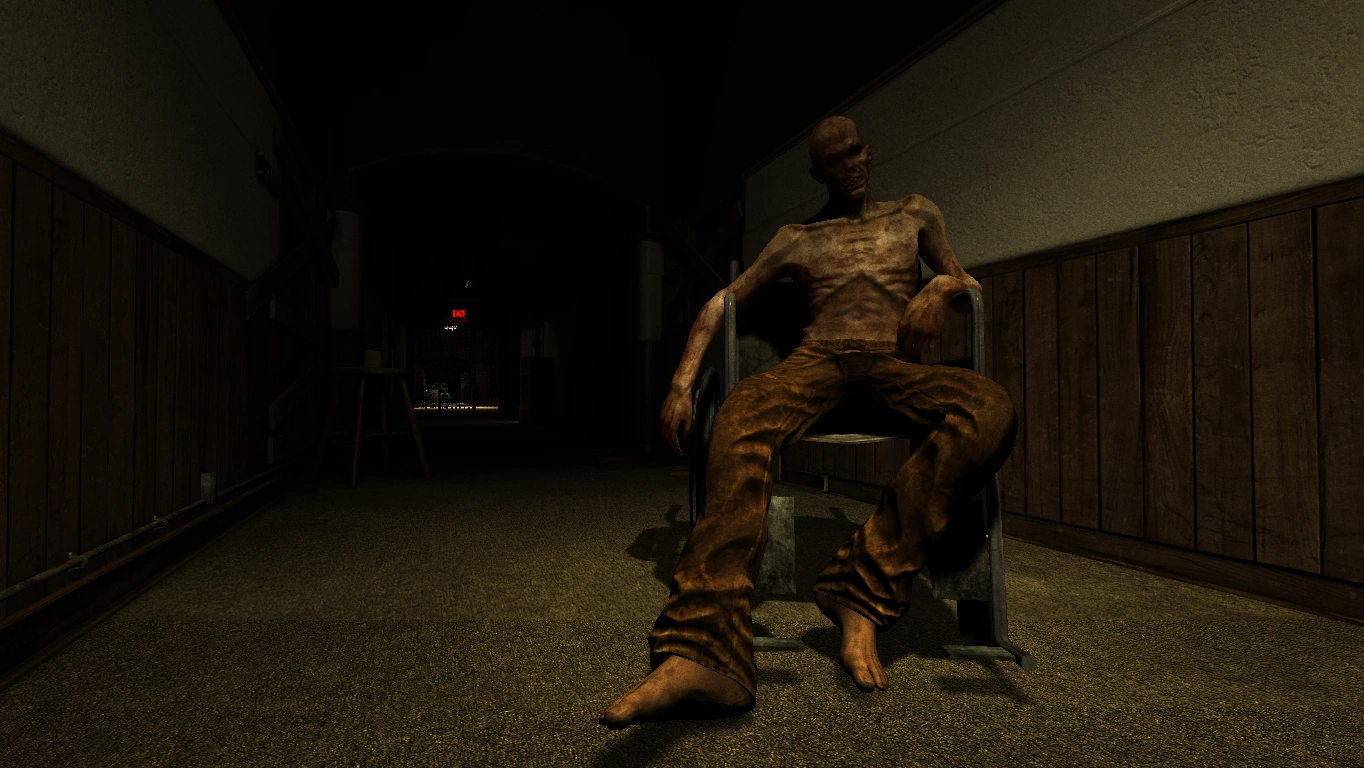 The wheelchair Variant is only encountered on the first floor of the Administration Block. He is eyeless, at first appears to be wheelchair-bound, and is in nothing but a pair of scrub trousers. While at first ignoring him, he will attack Miles his second lap through his corridor by pouncing on him and hysterically begging for help, screaming "The doctor is dead!" Miles kicks him off and the Variant shrivels up in the corner.